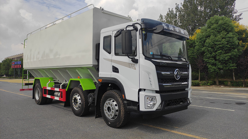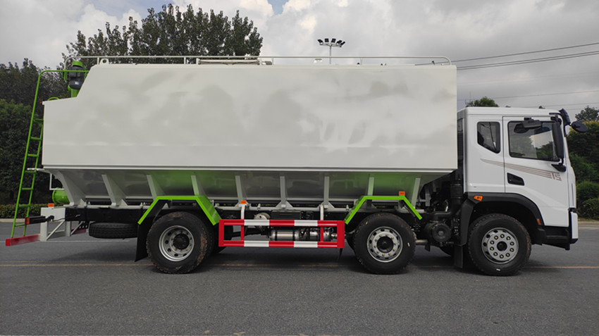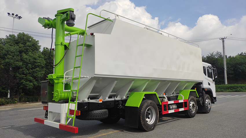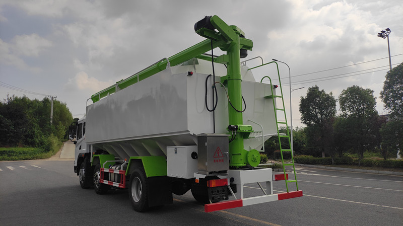 散裝飼料運輸車,散裝飼料車的飼料罐架設在卡車的底盤上,罐頂開有進料口.頂部的一根螺旋輸送卸料管(俗稱卸料絞龍)則可自由回轉和抬升,抬升的仰角可達60度。運輸時,頂部的螺旋管平臥在罐頂;卸料時則抬起,使管端的出料口與畜禽飼養(yǎng)場貯料罐頂部的進料門相接,駕駛室內裝有操縱裝置(操縱裝置也可裝置在罐體尾部),卸料時通過車底的動力輸出軸和減速器來驅動螺旋,以完成卸料。